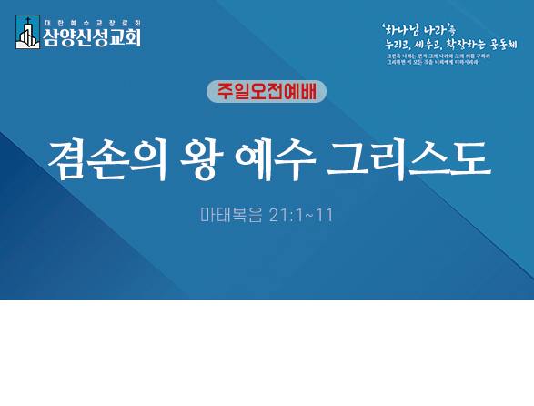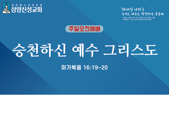 | 말씀선포 | 본문 : 마가복음 16장 19절 - 20절 (신. 85) "승천하신 예수 그리스도" 설교 : 현용완 담임목사 | 온라인 헌금 계좌 | 284001-04-088722 (국민은행) 예금주 : 삼양신성교회 --------------------------------------- * Worship at 삼양신성교회 주소 : 서울시 강북구 인수봉로 12 (미아동) 전화 : 02-988-5027 02-981-5831 | 예배 안내 | - 주일 2부 오전예배 매주 주일 오전 10:30 4-5층 본당 - 오후찬양예배 매주 주일 오후 02:30 4층 본당